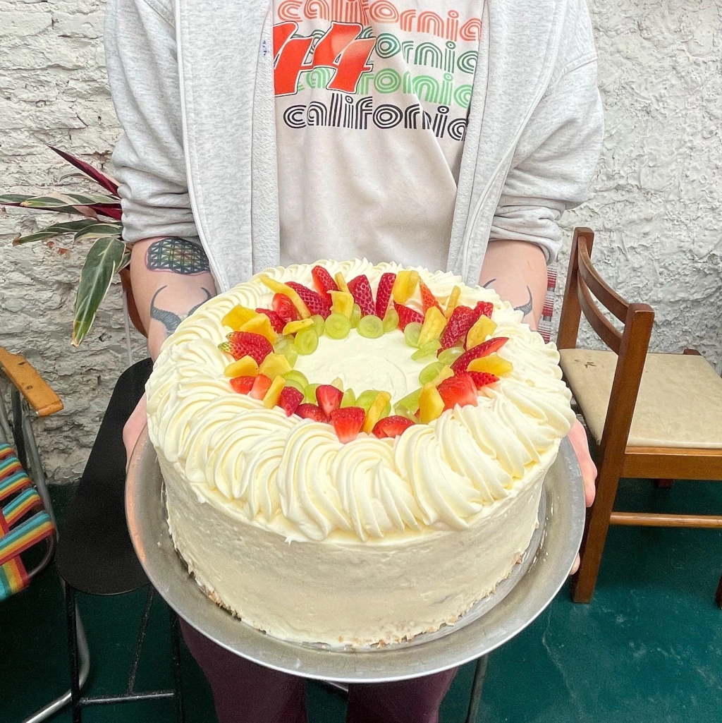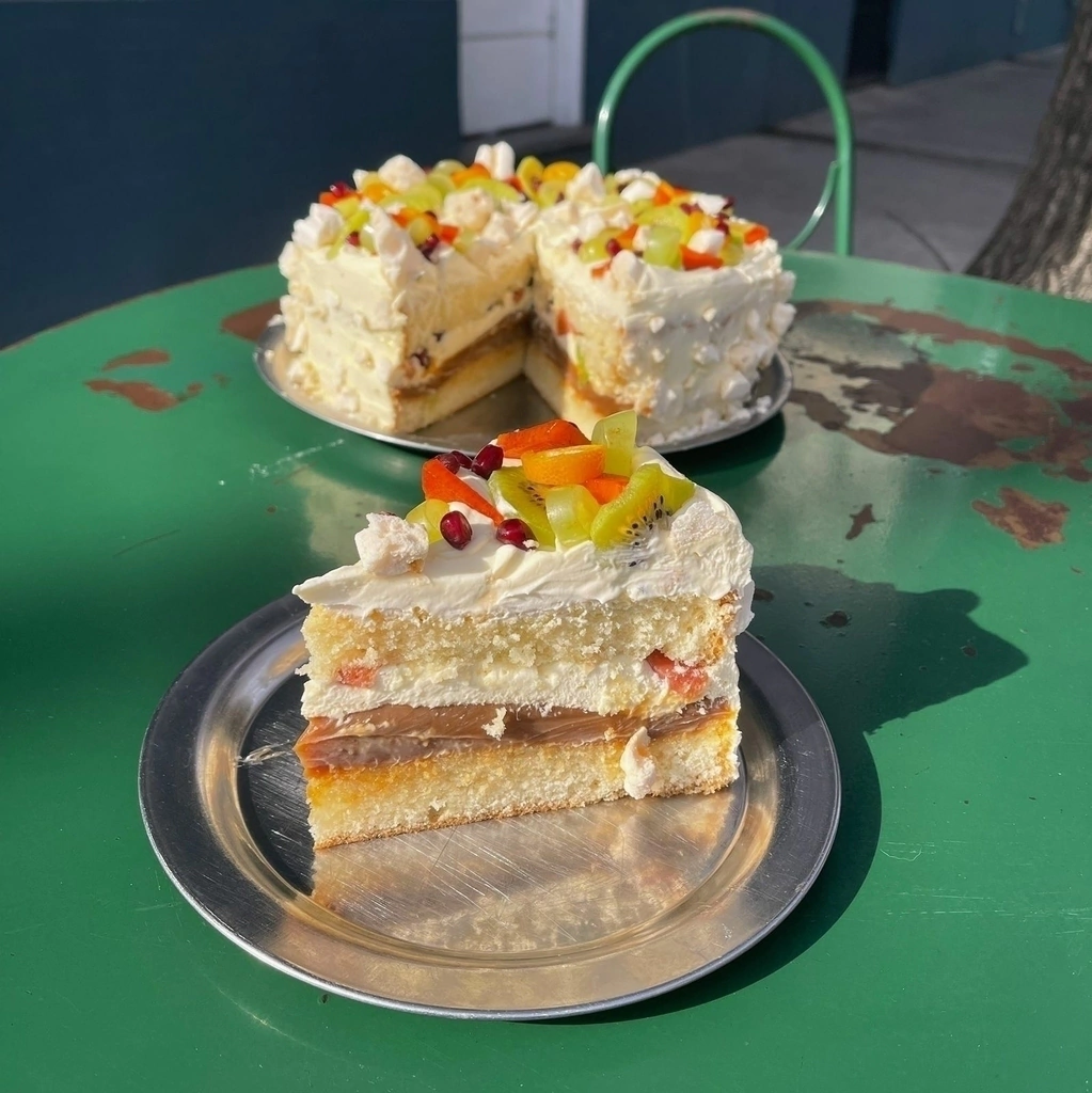 Genoise, dulce de leche, crema, merengues y frutas de estación. Las frutas cambian todos los días, elegimos las más lindas :)